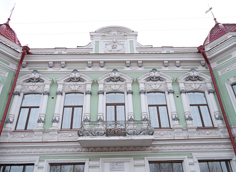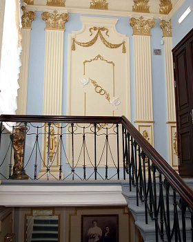 Описание: Дом купца П.Т. Корешева - это роскошный дворец: окна обрамлены волютами, колонны обвиты гирляндами, картуши с гербами, а перила - узорчатые. Второй этаж дома предусматривался для жилья хозяев, нижний этаж - под магазины и конторы. Дом Корешева – один из немногих купеческих домов Сарапула, где сохранилось внутреннее убранство: лепнина на потолке, изразцовые камины и печи.