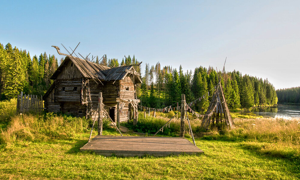 Описание: Место живописное и очень кинематографичное: укрытый со всех сторон холмами и густым лесом, берег спускается к блестящей на солнце реке. Для съемок здесь было построено несколько домов, святилище-куала и дом князя. Постройки стилизованы под исторический период жизни удмуртов в 12 веке.