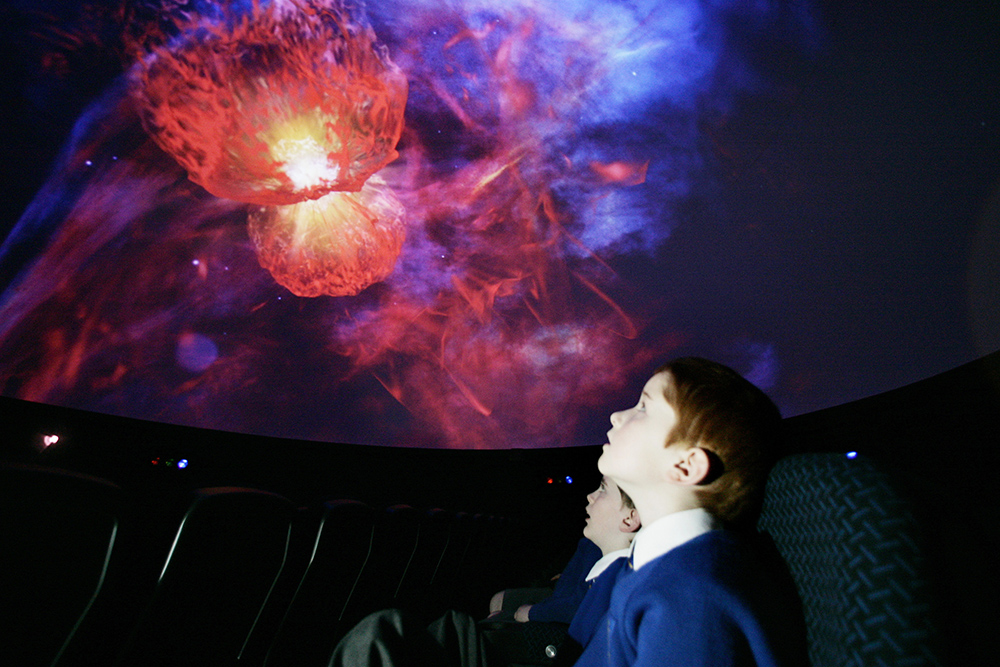 В здании установлен купольный экран с обзором в 360 градусов. Применяются цифровые технологии сферического проецирования (Full Dome Video), что позволяет демонстрировать звёздное небо и космос во всем его многообразии. Сферический купол полностью охватывает область зрения человека, что создает эффект погружения у зрителей.