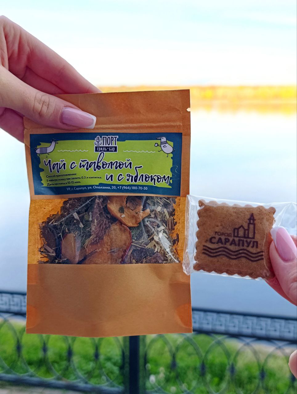 Прогулялись? Аппетит нагуляли? Добро пожаловать на купеческую трапезу, которая проходит в Гриль-баре «Порт» с панорамным видом на Каму. Путешественников ждут необычные для наших дней угощения: сельдевый пастет и маринованная щука (есть их нужно не как-нибудь, а намазывая на хрустящей ломтик сарапульского хлеба). В меню также сарапульские напитки, уха калья с судаком и рассолом, пирожки карасики с тыквой и пшенкой. А чая не будет! Будет ароматный взвар травы таволги, которую удмуртские шаманы считают мистической. Каждый сможет забрать с собой кусочек разгонного пряника.