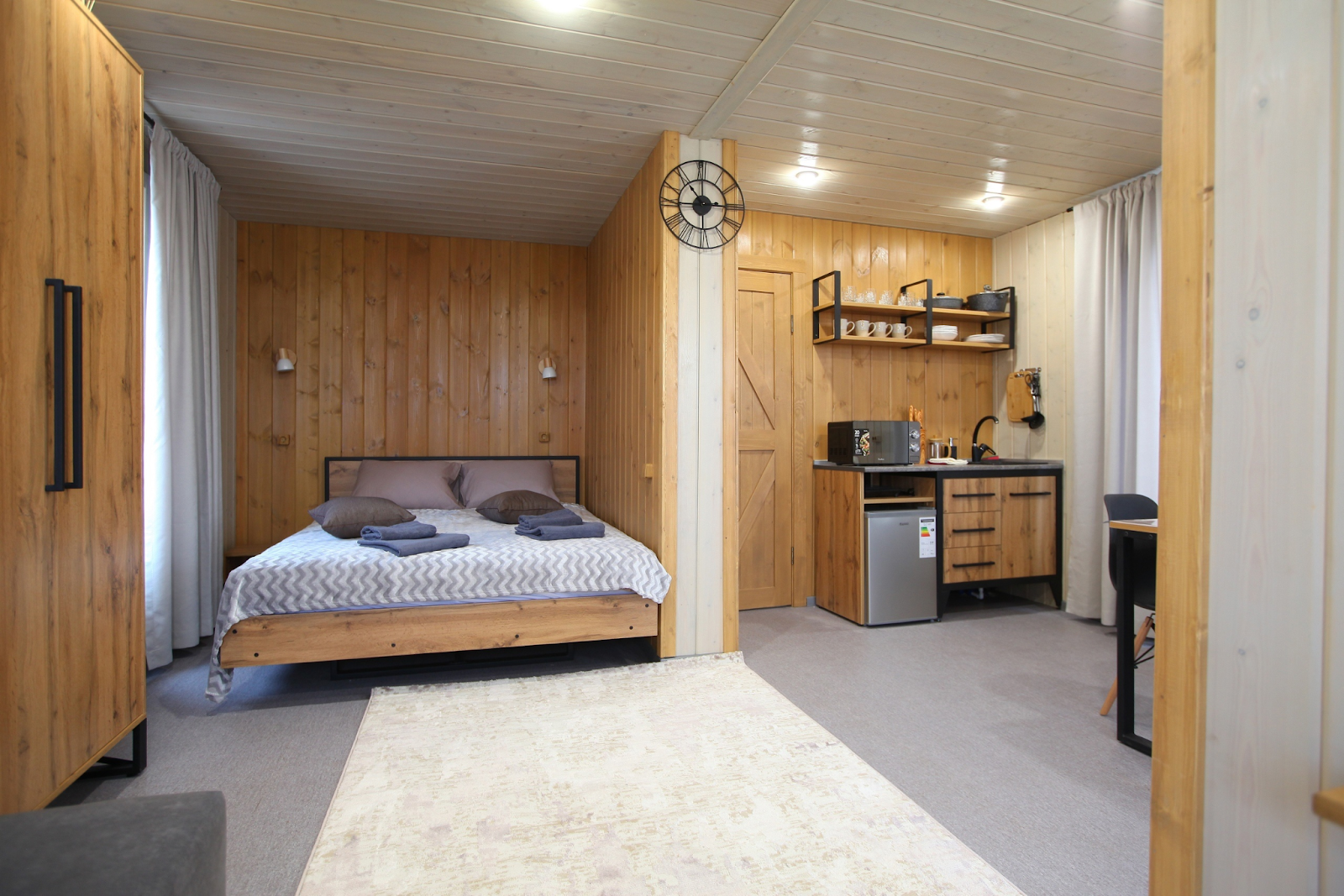Каждый дом «Пичи дачи»- это уютное эргономичное пространство для комфортного проживания целой семьи: двуспальная кровать - для взрослых, а раскладной диван подойдет для двоих детей. Дом с панорамными окнами открывает восхитительный вид на лес и красивые поля.
