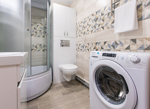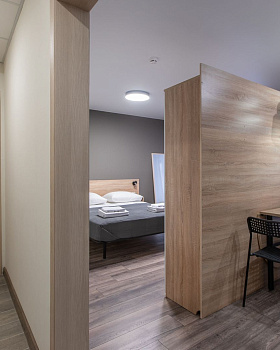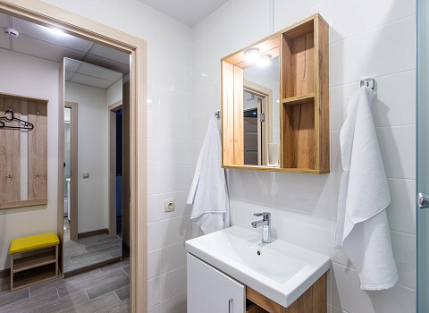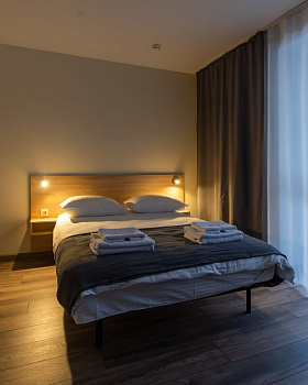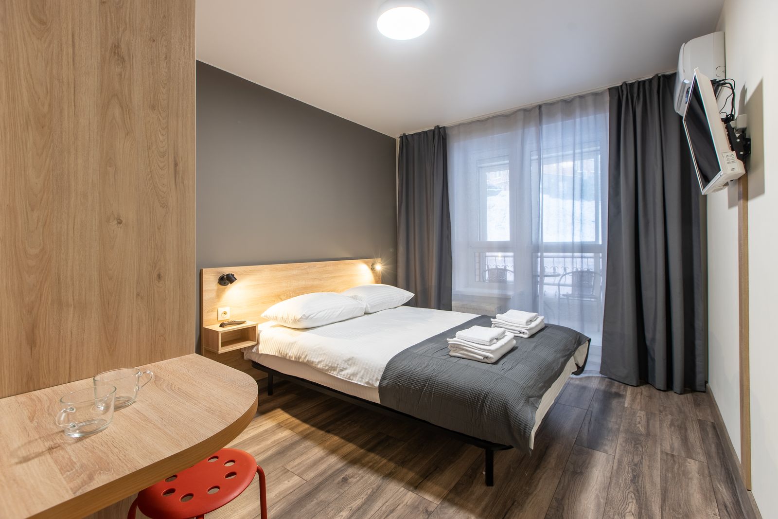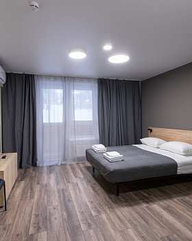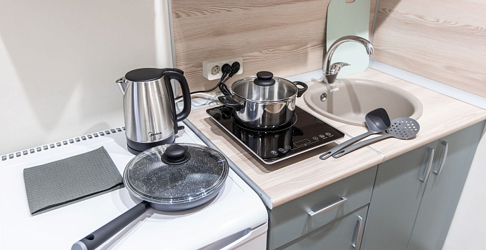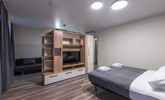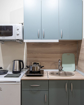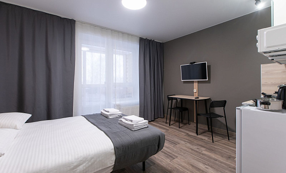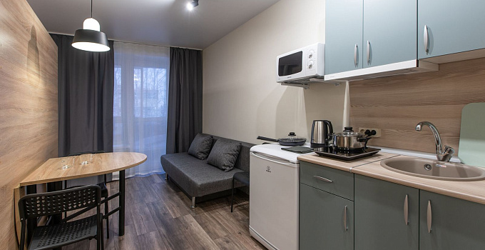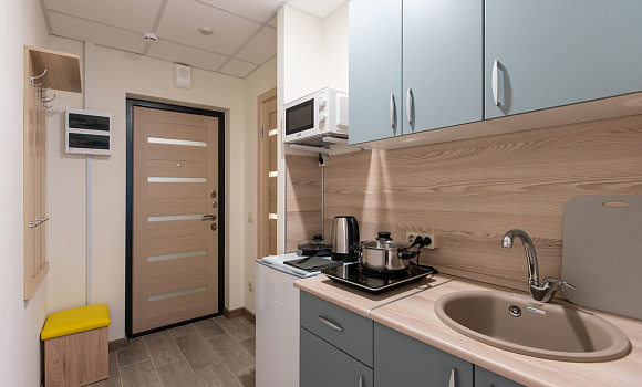 Каждый номер — это квартира "студия" с полным набором необходимой бытовой техники, посуды и столовых принадлежностей. Бутилированная вода, чай/кофе/сахар, ну и конечно же бесплатный Wi-Fi.
