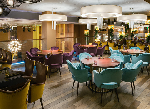 В контраст шумному залу гостей удивит «Зимний сад» — место где можно уединиться, полюбоваться орхидеями и экзотическими растениями. Так же этот зал идеален для проведения выездных регистраций, мастер-классов и всевозможных интерактивов. Стеклянная крыша создает много естественного света, увеличивая пространство зала. Используя архитектурные приемы и современные акустические материалы, нам удалось добиться великолепной акустики во всех помещениях. Стоит отметить, что диваны, обеденные столы, барная стойка, светильники, элементы декора выполнены по индивидуальным эскизам. Скульптуры и барельеф, так же являются авторскими.