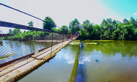 Построен над рекой Ита, длина – 70 м, высота - 7 м. Прячется за кустами, найти непросто. Держится на железных столбах, на стальных тросах раскачивается в такт реке. Мост жители используют только летом