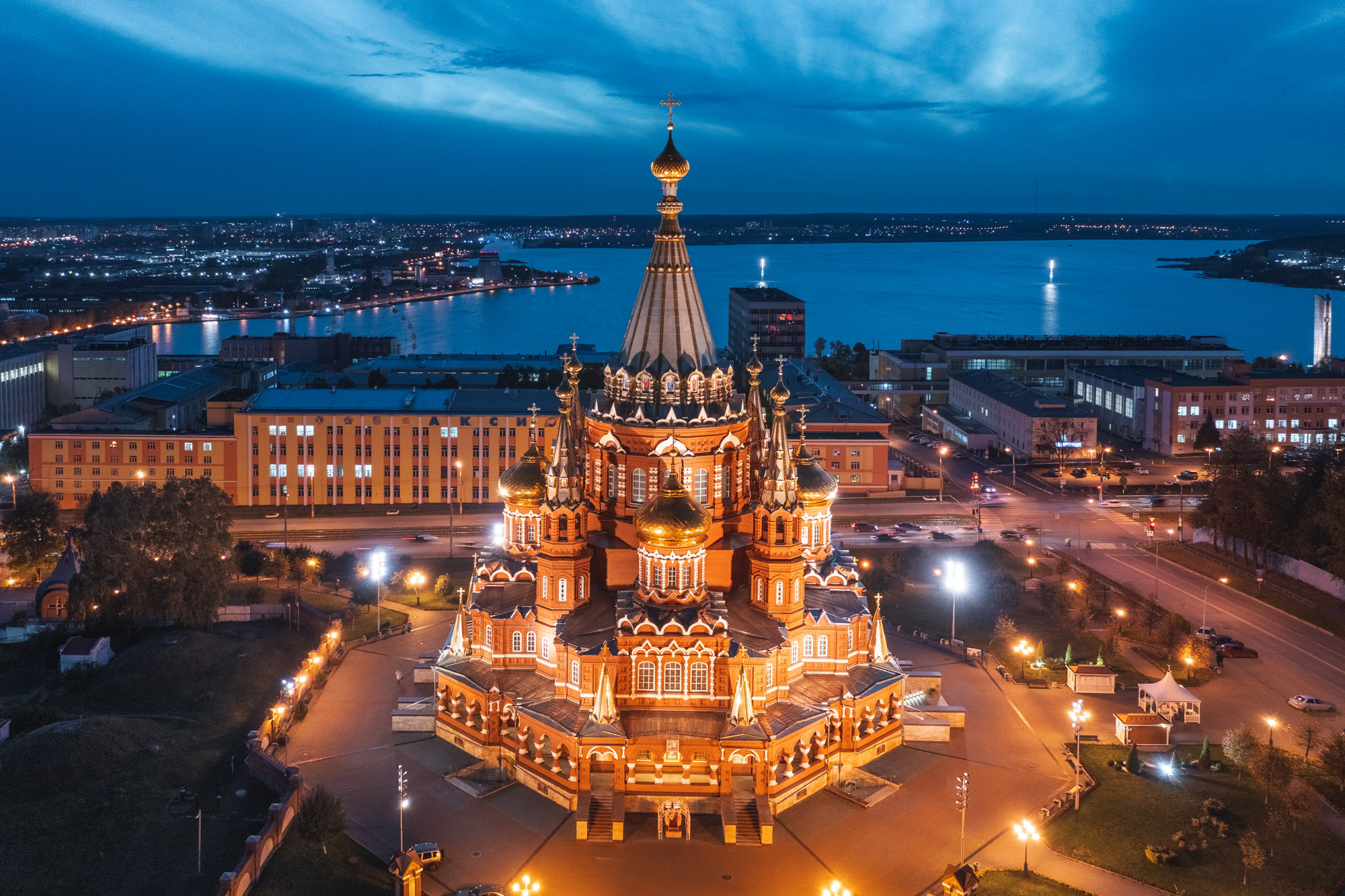 Золотые купола храма каждый путешественник, въезжающий в город, видит издалека, ведь собор стоит на одной из самых высоких точек Ижевска. Гостей города поражает его резной силуэт. 67-метровый храм, открытый в 2007 году, до мельчайших подробностей воспроизводит Свято-Михайловский собор, построенный в 1907 году по проекту Ивана Чарушина и разрушенный в 1937-м. Около храма в 2012 году появился памятник святым Петру и Февронии Муромским, рядом стоит «скамья примирения» и растет кедр, посаженный оружейником Михаилом Калашниковым. В соборе хранится немало святынь, в том числе частица мощей святого Николая Чудотворца.