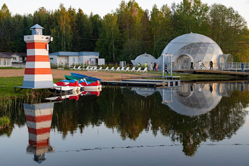 Удобства и развлечения: На территории — пляжная зона, аренда сапбордов, катамаранов и речных трамвайчиков. Можно позагорать на понтоне, прокатиться по пруду или устроить пикник у воды. Главный символ базы — маяк, возле которого можно загадать желание и сделать эффектные фото. Есть круглогодичный геокупол — пространство для мероприятий любого формата.