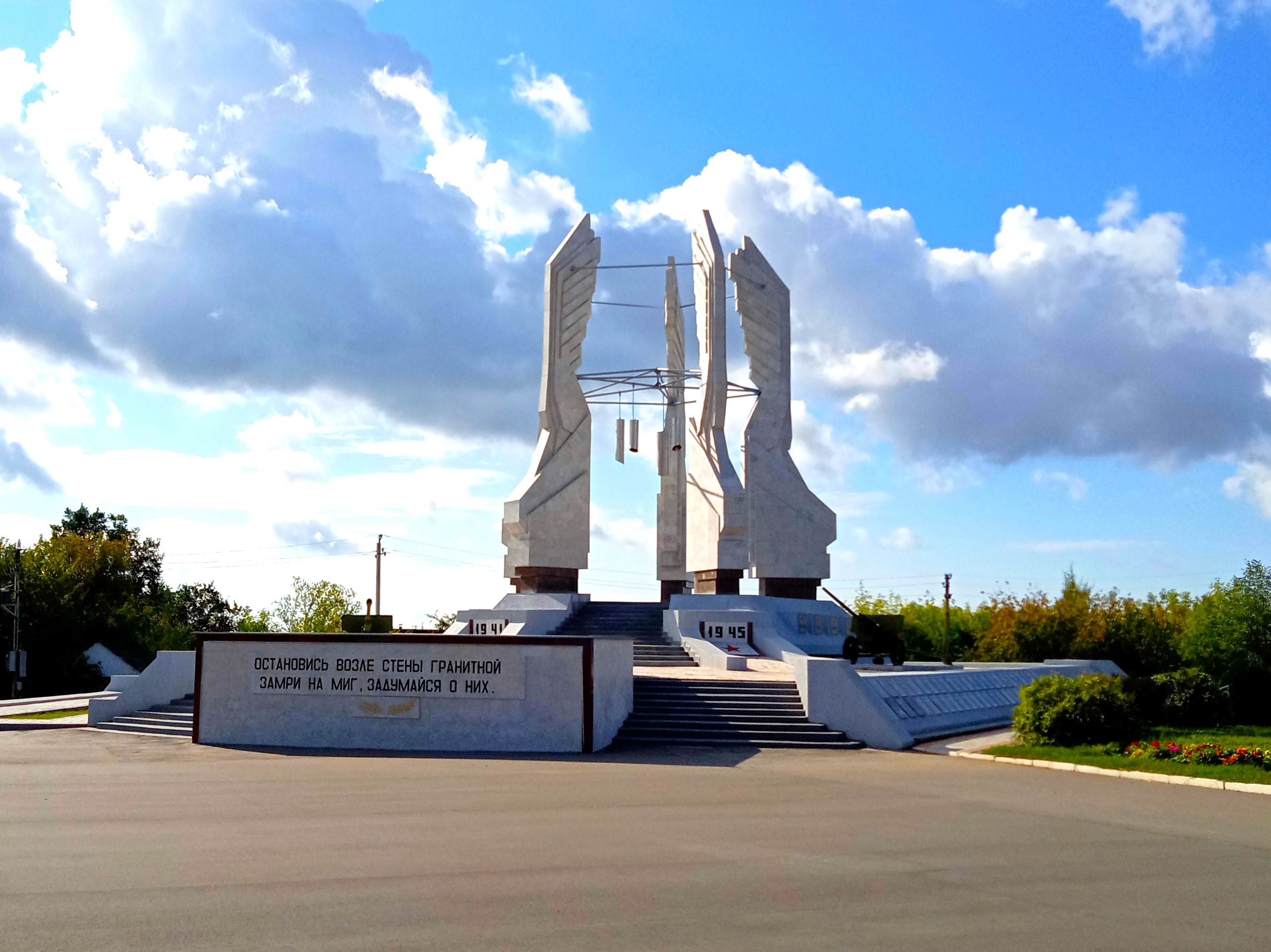 Описание: Строительство мемориала началось по инициативе руководства района в 1979 году. Крылья символизируют полет невинно убиенных душ, в центре расположены колокола, которые должны напоминать живым своим звоном о погибших земляках. Мемориал является самым величественным среди памятников, посвященных Великой Отечественной войне, стоящих в районных центрах России.