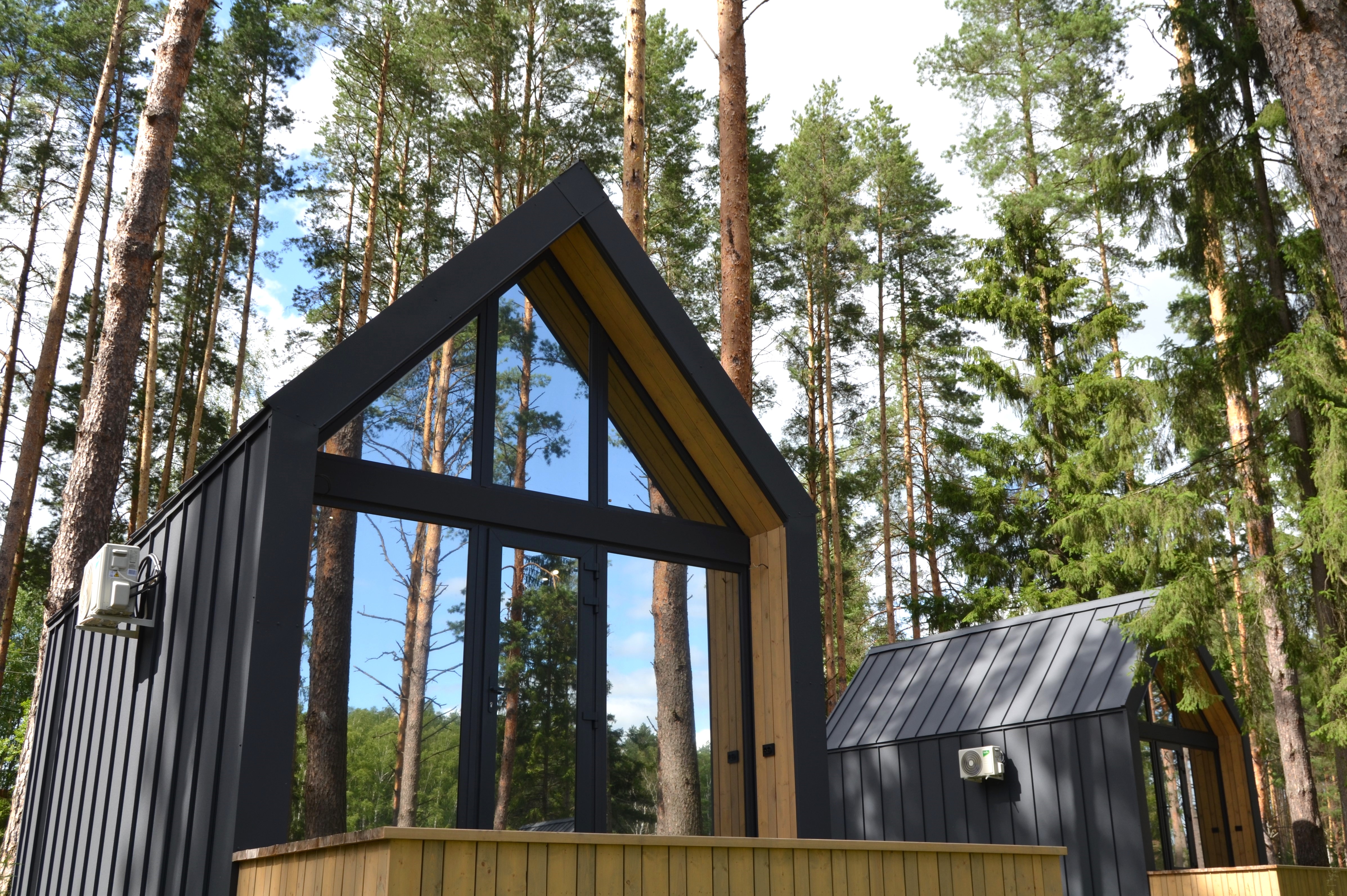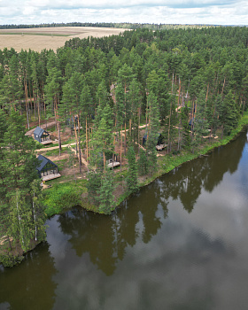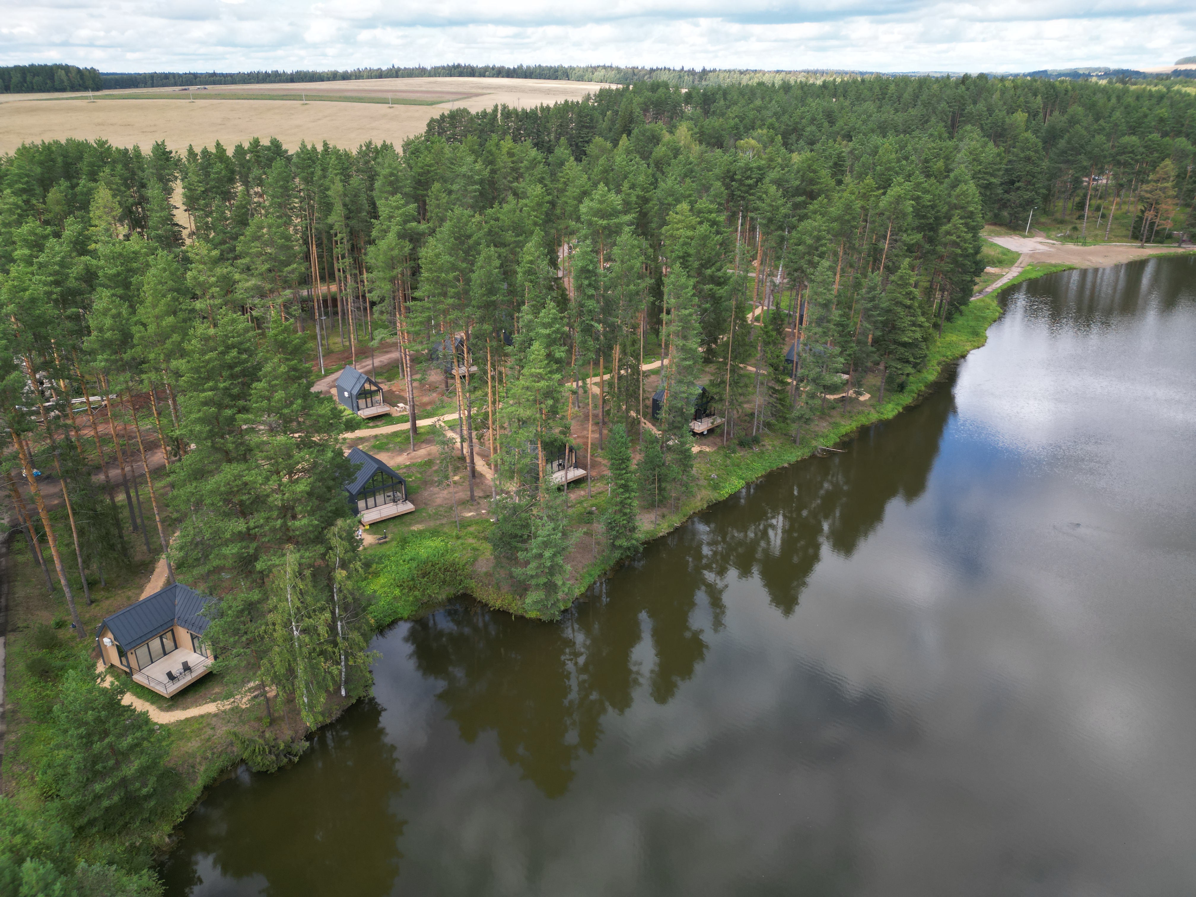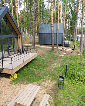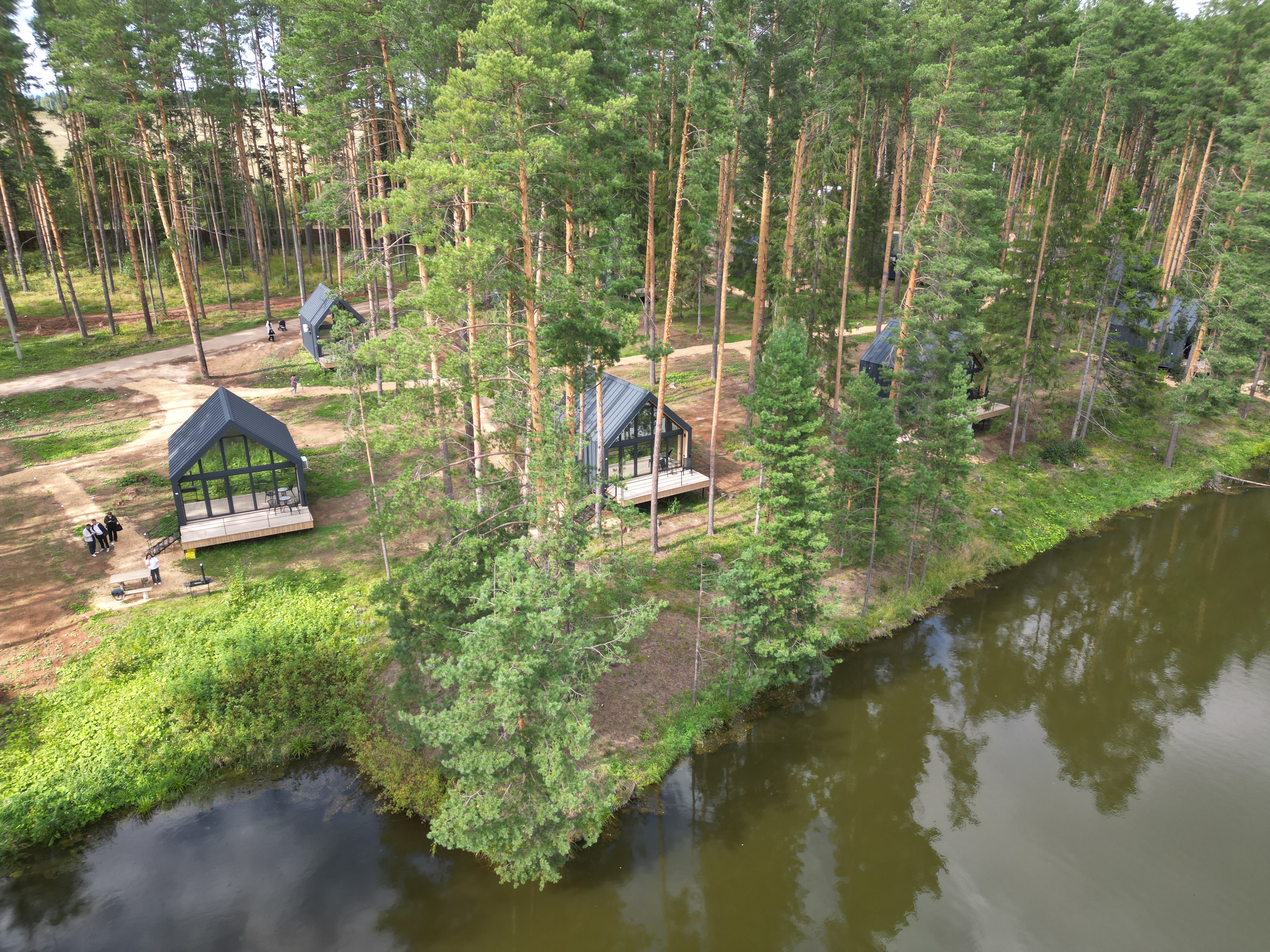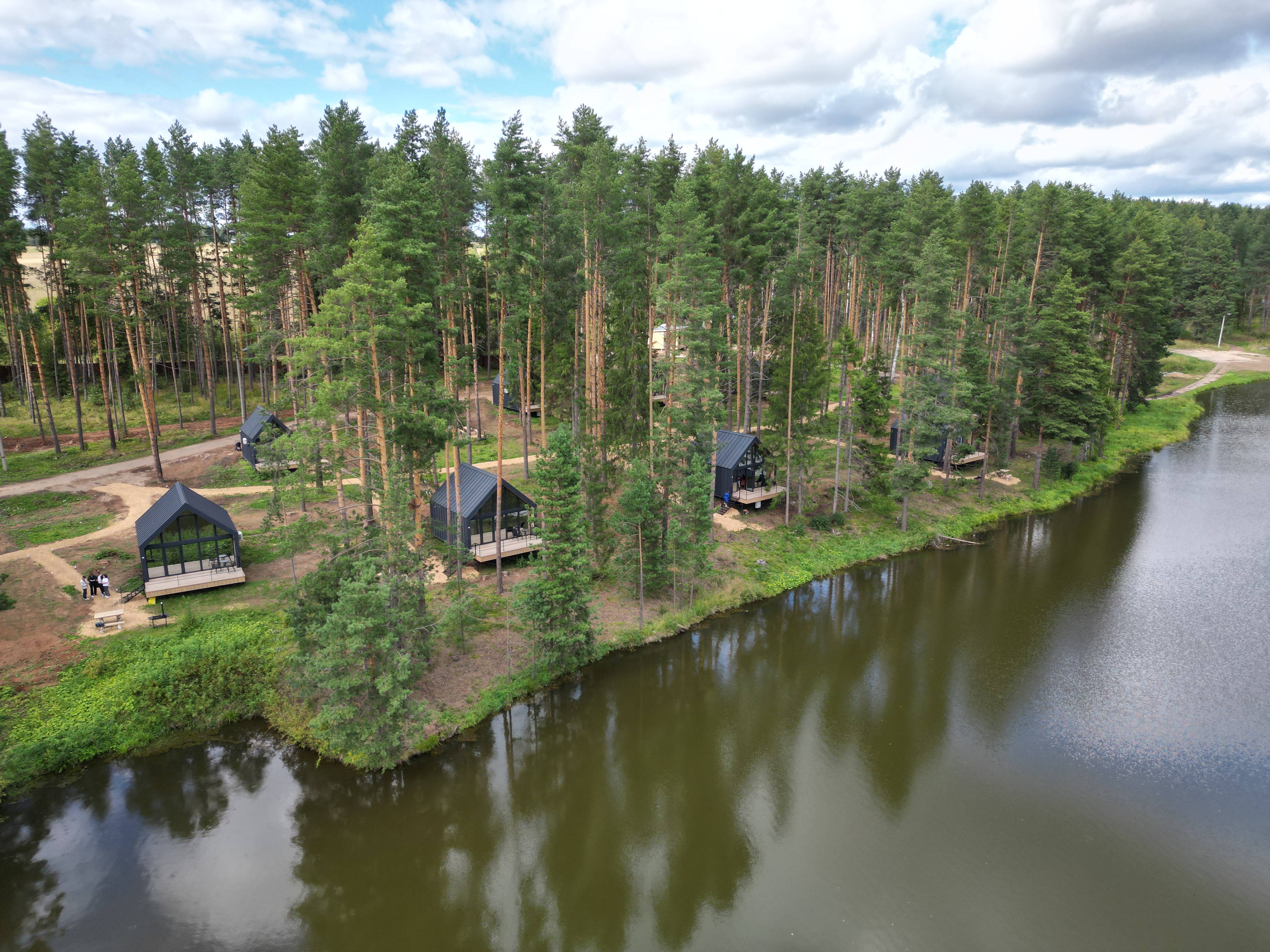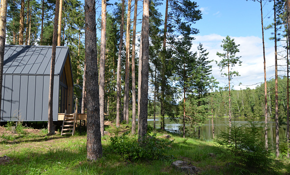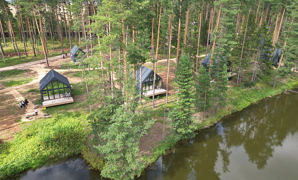 Здесь гостей ждут 33 модульных дома различной вместимости, стоящие на берегах трех прудов среди первозданного леса, в котором преобладают величественные сосны.